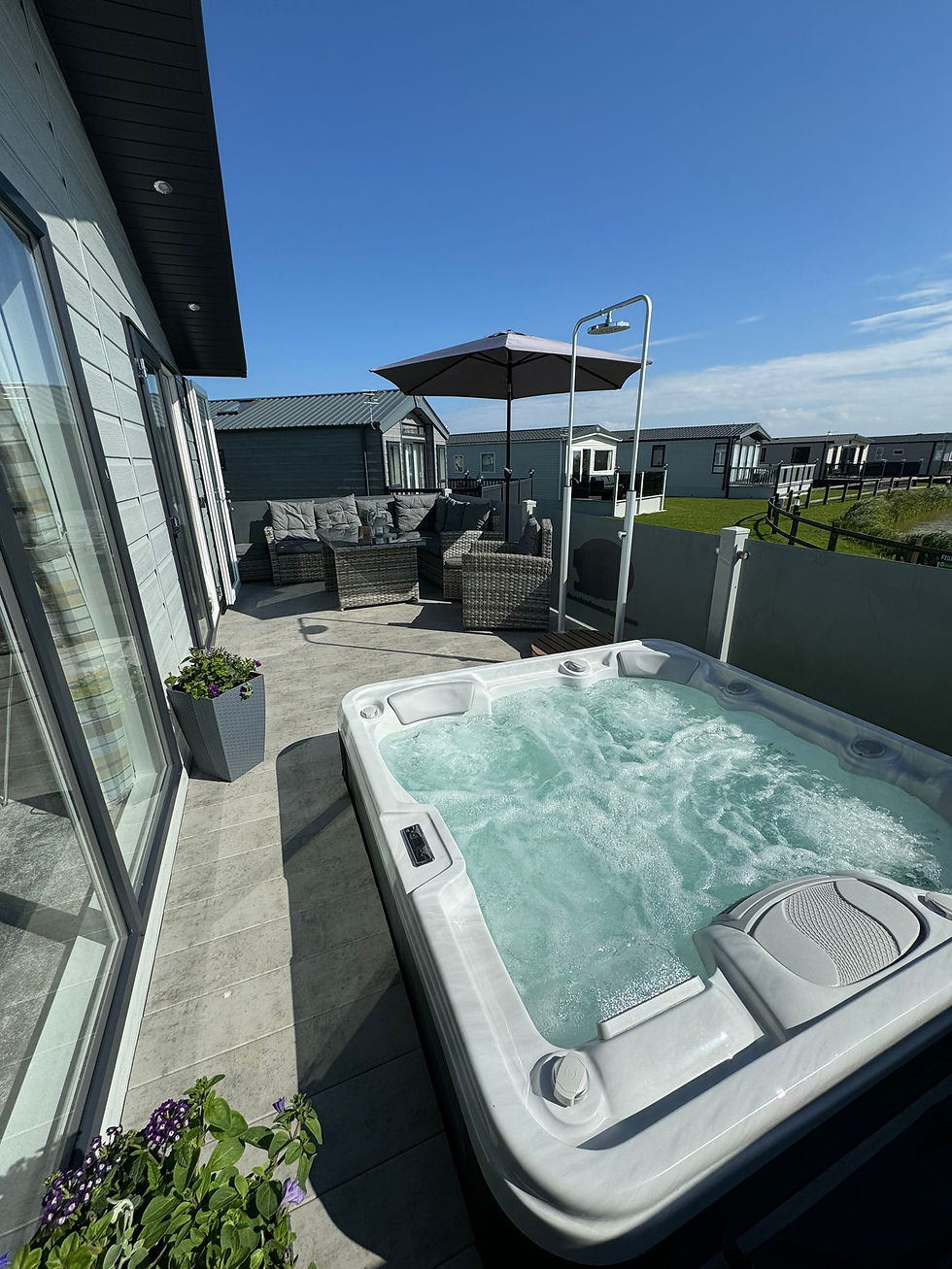 Offering a large open space leading into the kitchen and dining area. The living room has double doors leading out onto the balcony with outdoor seating and hot tub overlooking a fishing pond. (The sofa is fitted with a double foldout sofa-bed.